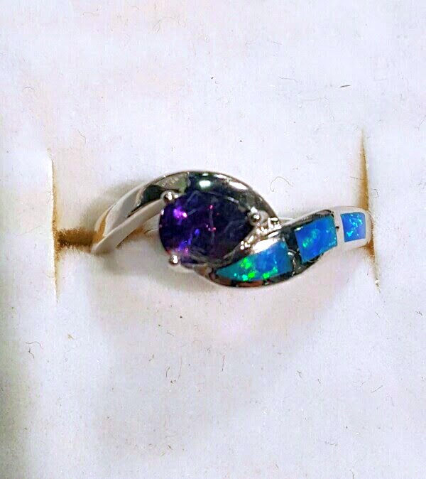 Synthetic Opal Inlay with Teardrop Amethyst CZ Ring Size: 6 Metal: 925 Sterling Silver